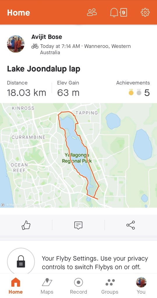18.3 Kilometers ride along the Lake Joondalup whole lap..Got a bit lost and took a wrong turn and entered the residential pathway in Woodvale. But finally managed to take the right way . It was fun.. It’s a solo ride and stopped twice in between for drinks and enjoy the views. Thanks Amrita for all the support and encouragement .